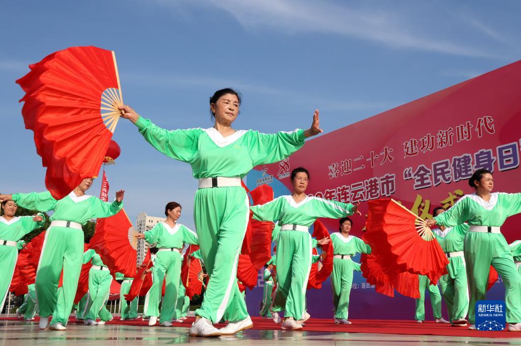 8月8日,在江苏省连云港市苍梧绿园,市民参加全民健身日群众展演活动。