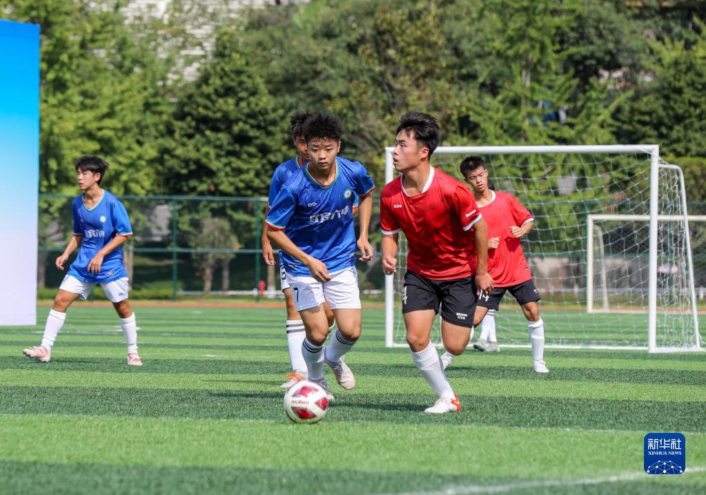 8月8日,在四川省宜宾市人民广场体育公园,青少年在五人制足球比赛中拼抢。