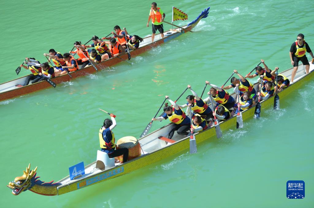 8月8日,市民在湖北省宣恩县仙山贡水旅游区的贡水河上参加划龙舟比赛。