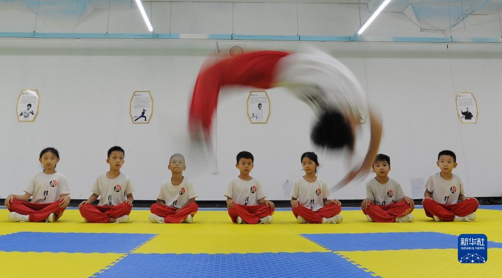 8月8日,小朋友在山东省滕州市一家武术培训机构训练。