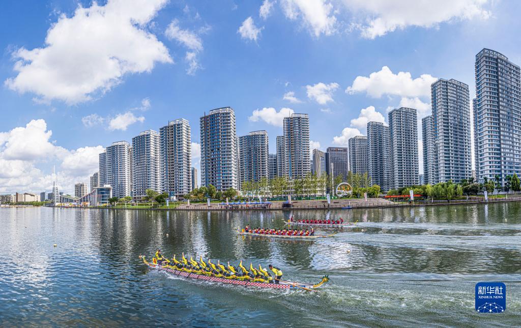 8月8日,在浙江省温州龙舟运动中心,选手们驾着龙舟在500米直道赛中角逐(无人机照片)。