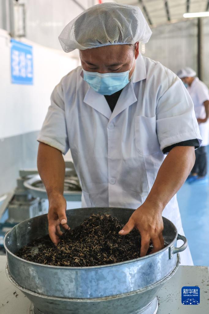 8月9日,工作人员在石阡县枫香乡梨子园村茶叶加工厂内对茶叶进行烘干。