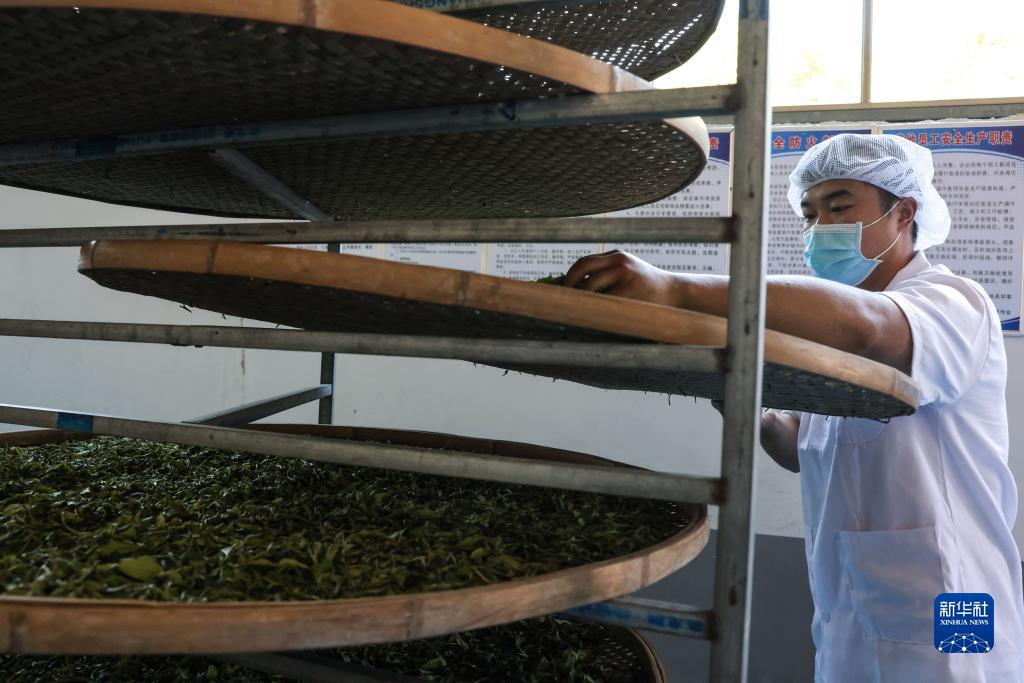 8月9日,工作人员在石阡县枫香乡梨子园村茶叶加工厂内对茶青进行摊晾。