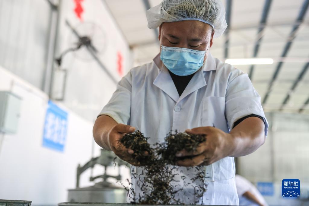 8月9日,工作人员在石阡县枫香乡梨子园村茶叶加工厂内对茶叶进行烘干。