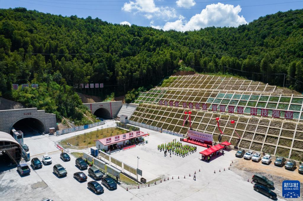 8月9日在衡永高速祁山隧道洞口拍摄的隧道贯通仪式(无人机照片)。