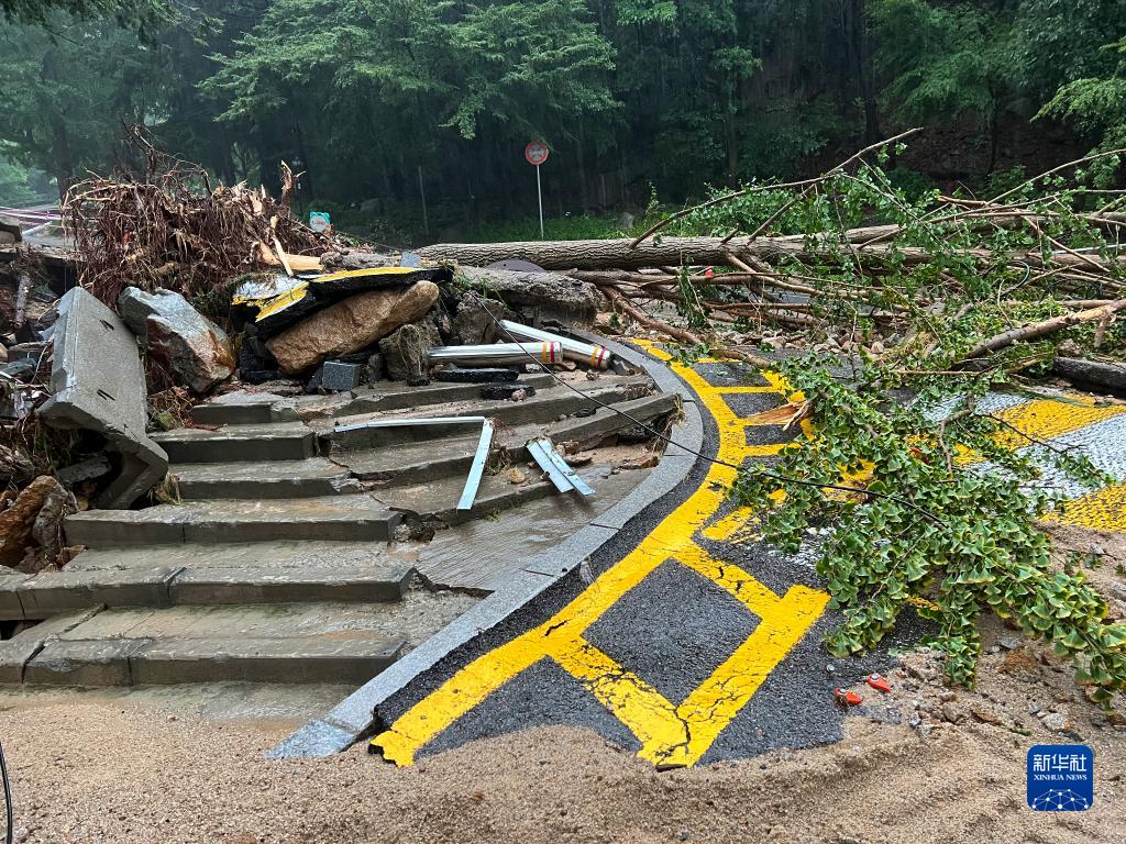 这是8月9日在韩国首尔大学拍摄的因遭遇强降雨而倒下的树木和受损道路(手机拍摄)。