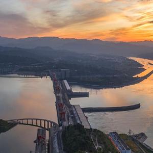 日出时分,在湖北省宜昌市秭归县,朝霞把长江三峡大坝装扮得美不胜收(8月9日,无人机照片)。