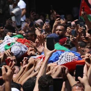 8月9日,人们在约旦河西岸城市纳布卢斯参加被以色列军队打死的巴勒斯坦人的葬礼。