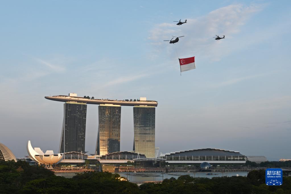 8月9日,直升机在新加坡滨海湾举行的国庆庆典上展示新加坡国旗。