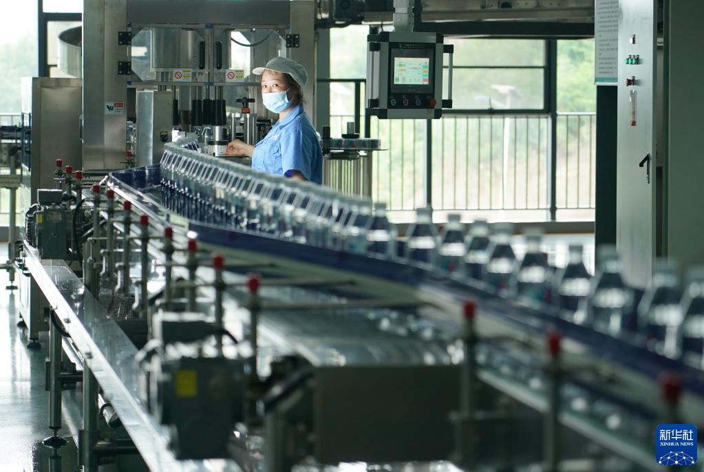工人在陕西省汉阴县一家包装饮用水公司生产车间内作业(2021年6月2日摄)。