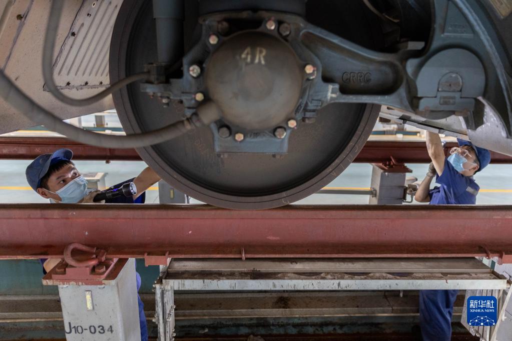 8月10日,动车组机械师对动车组进行检查。 新华社记者 王翔 摄