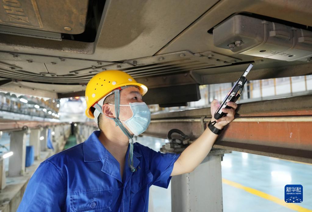在中国铁路上海局集团有限公司南京动车所内,南京电务段动车车载设备车间工作人员检查动车轨道电路天线(8月3日摄)。