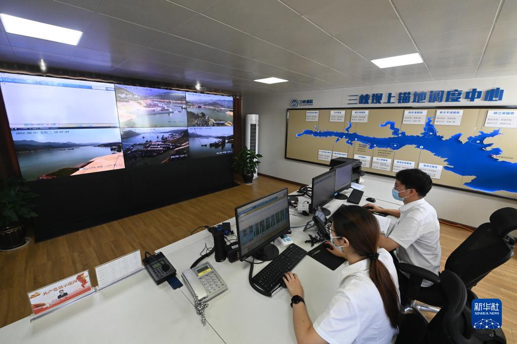 8月9日,三峡待闸锚地管理处工作人员在三峡坝上锚地调度中心指挥调度船舶。 新华社记者 蔡湘鑫 摄