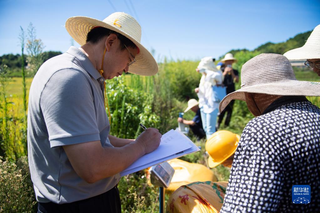 8月10日,在 “一季杂交稻+再生稻”生产模式宁乡示范基地头季稻测产验收现场,工作人员记录稻谷重量。