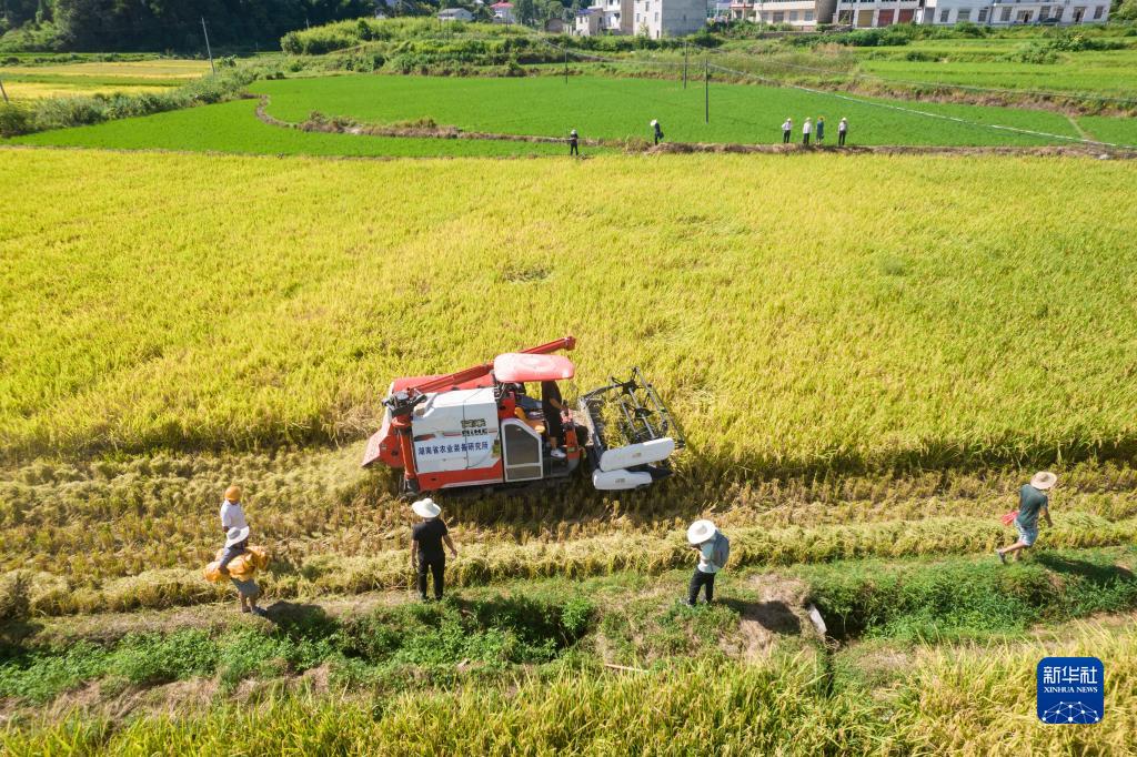 这是8月10日在湖南省长沙市宁乡市流沙河镇拍摄的“一季杂交稻+再生稻”生产模式宁乡示范基地头季稻测产验收现场(无人机照片)。