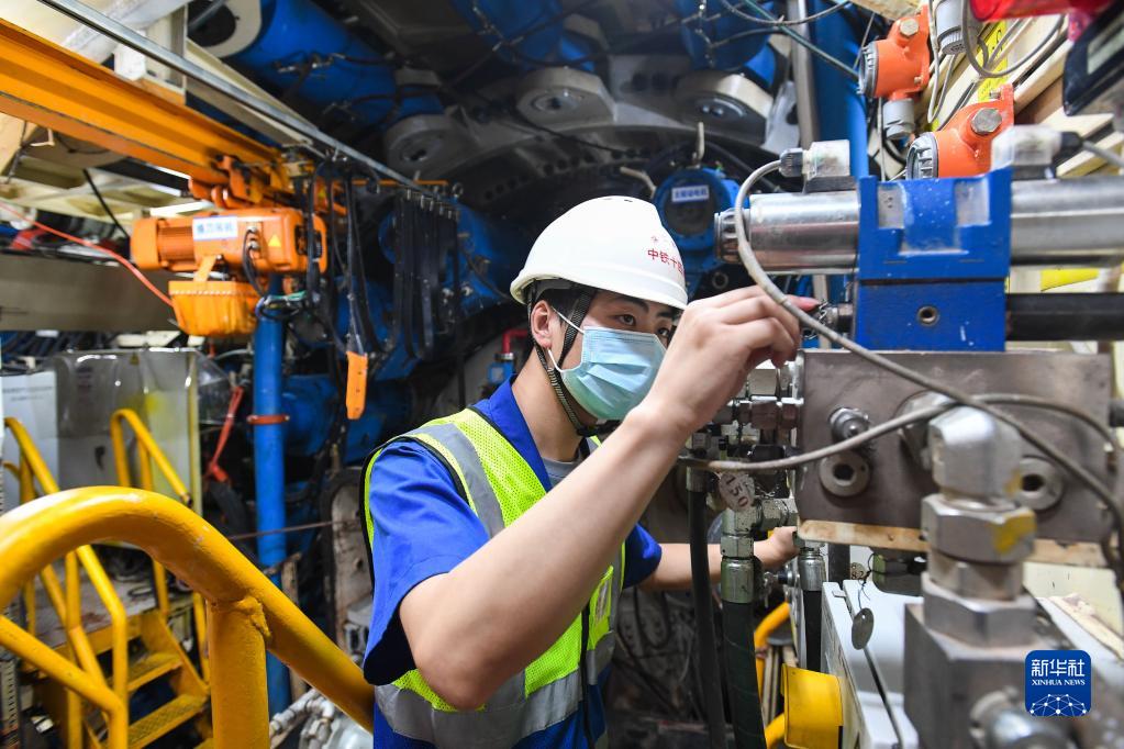 8月10日,施工人员在深江铁路珠江口隧道检查“深江1号”盾构机运行状况。