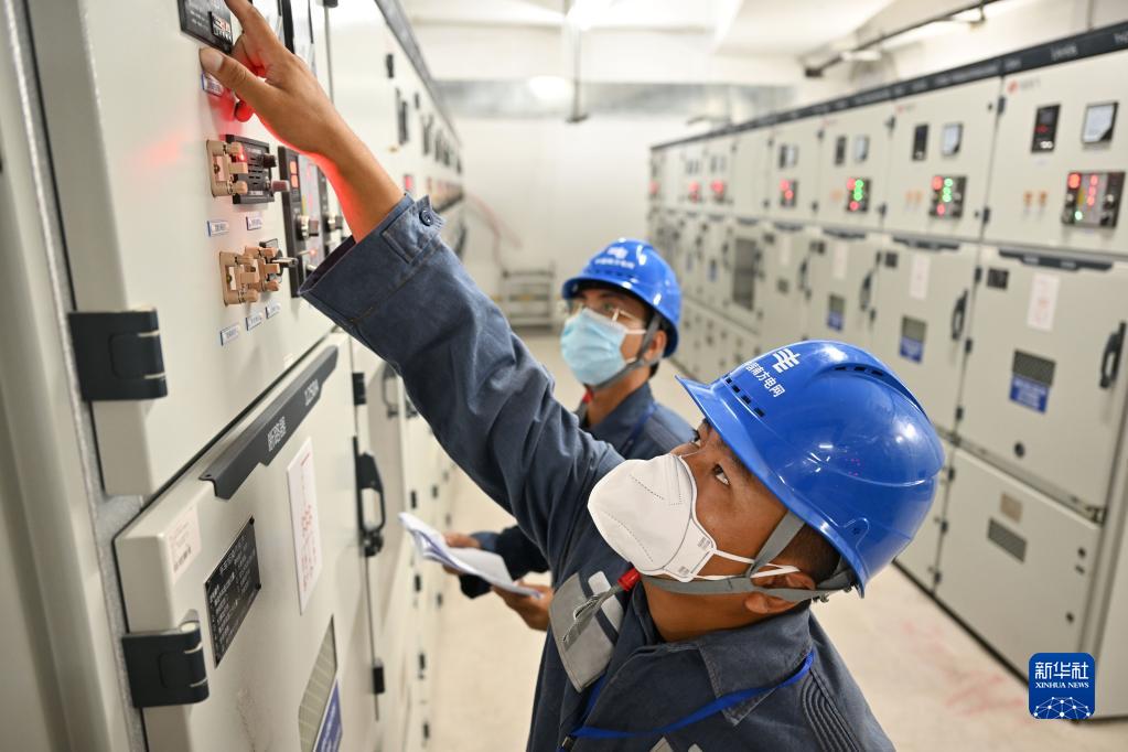 8月10日,三亚供电局工作人员在三亚第二方舱医院检查电力设备。