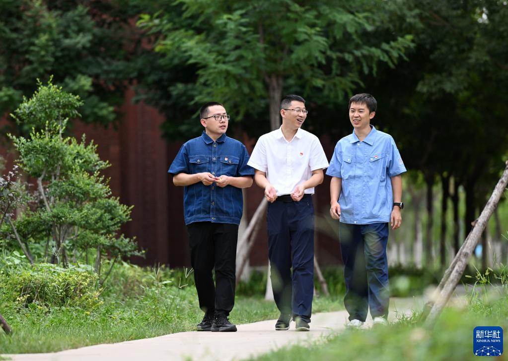 王兴东(中)、许超(右)和刘世雄在校园内交谈(8月8日摄)。新华社记者 赵子硕 摄
