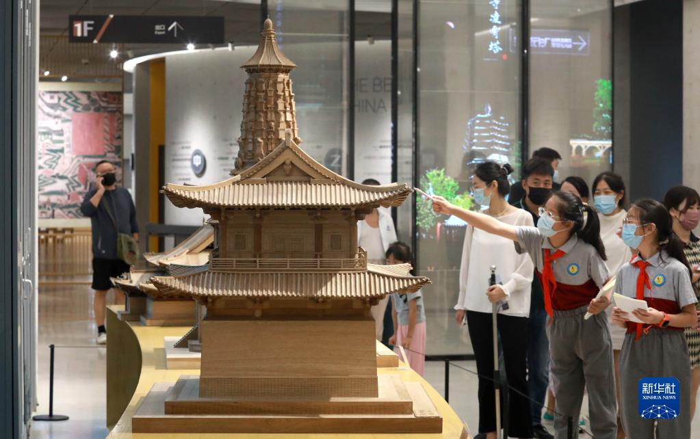 8月10日,在河北省石家庄城市馆,学生们在观看正定古建筑模型。