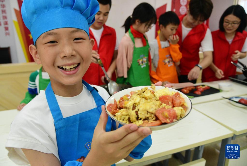 8月10日,在江苏省镇江市红光太古山社区,一名小朋友展示江苏大学志愿者指导他烹制的家常菜。