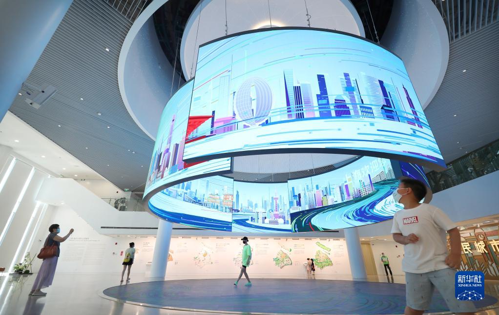 8月11日,参观者观看上海城市规划展示馆的“上海印象”城市画卷环形巨幕。
