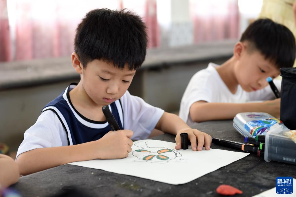 8月11日,合肥市蜀新苑小学的学生在暑期托管班里学习绘画。