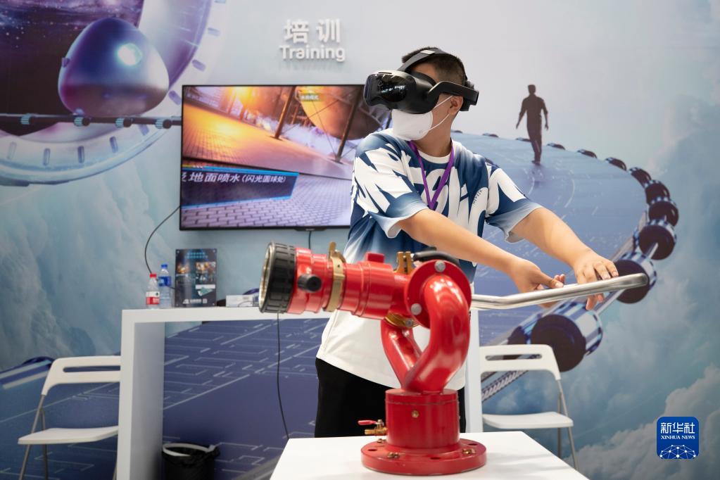 8月11日,在2022世界5G大会展厅里展示的5G网络支持下的5G+VR灭火培训平台。