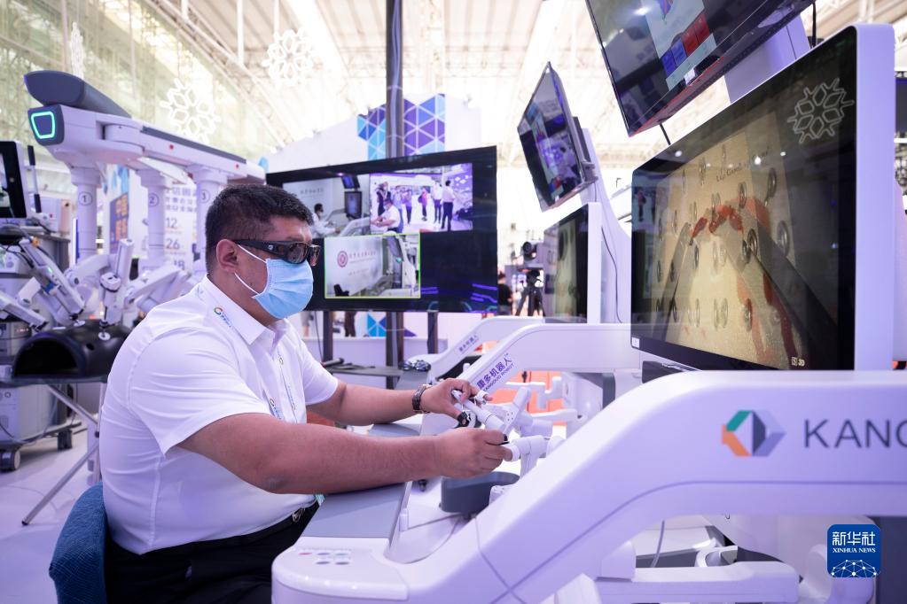 8月11日,在2022世界5G大会展厅里,参展商演示5G网络支持下的远程手术设备。