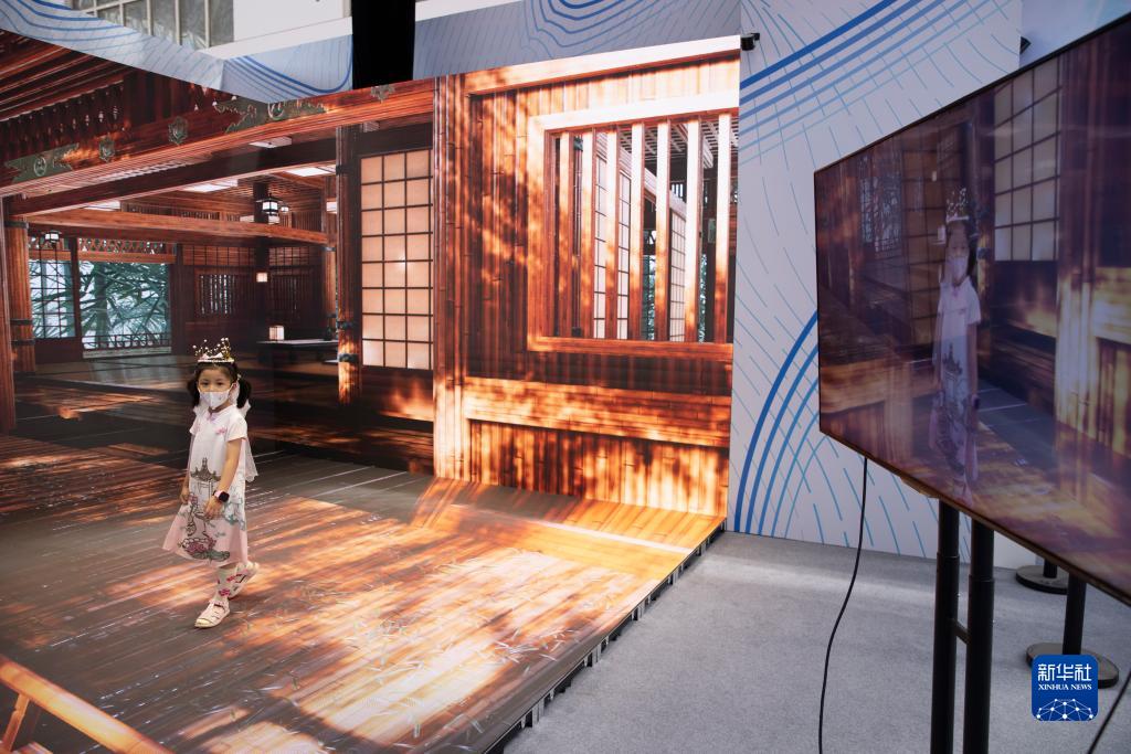8月11日,在2022世界5G大会展厅里,小朋友在体验5G网络支持下的虚拟影视制作。