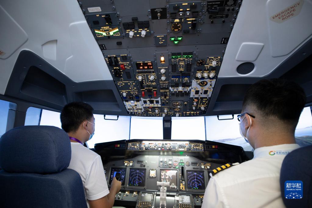 8月11日,在2022世界5G大会展厅里,参观者体验5G网络支持下的模拟飞行舱。