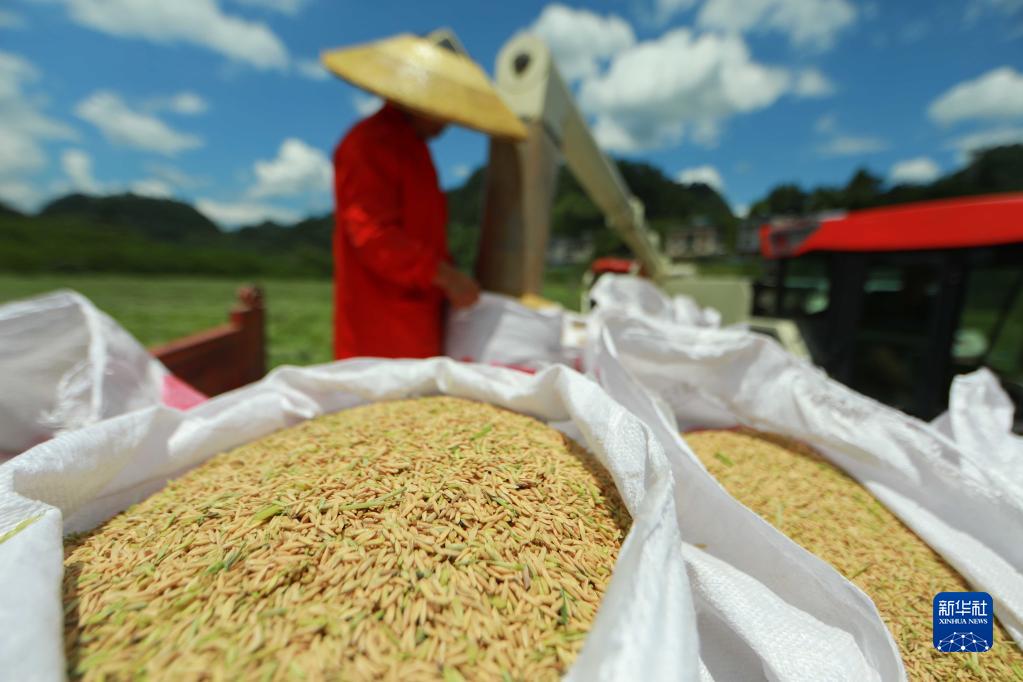 8月11日,村民在贵州省黔东南苗族侗族自治州岑巩县注溪镇周坪村杂交水稻制种基地将采收的种稻装袋。