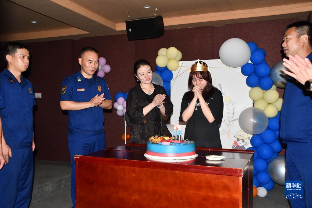 萍乡市消防救援支队的消防员们为陶佳煜(右二)庆祝18岁生日(7月11日摄)。
