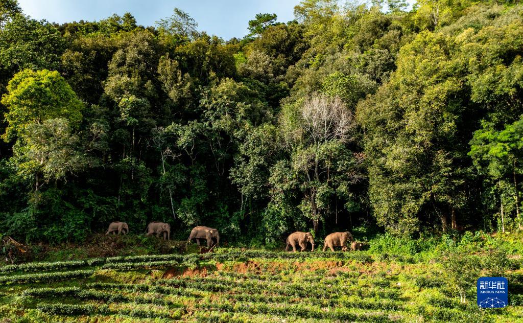 象群途经云南省普洱市江城哈尼族彝族自治县一村庄(无人机照片,8月1日摄)。新华社记者 江文耀 摄