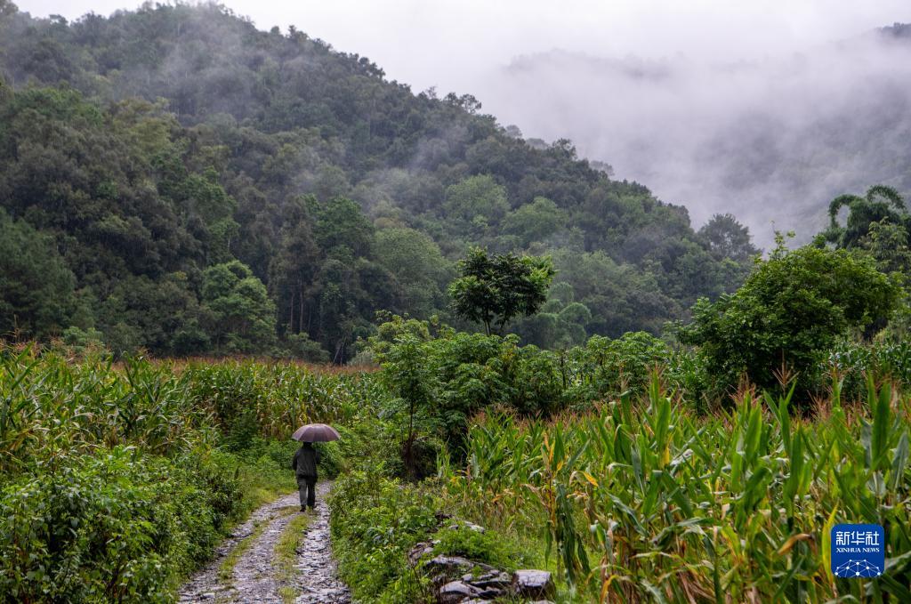 由于下雨,无法使用无人机监测,迟迟没有找到象群位置的刁发兴徒步进入山区寻找(8月1日摄)。新华社记者 江文耀 摄