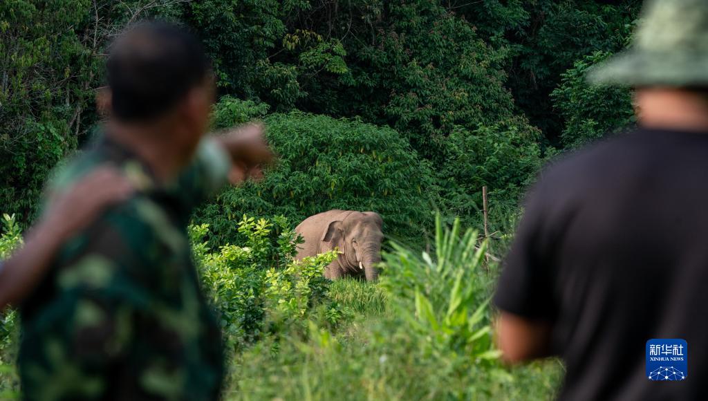 刁发兴(右)在观察村庄附近的野象(8月1日摄)。新华社记者 江文耀 摄