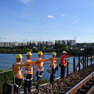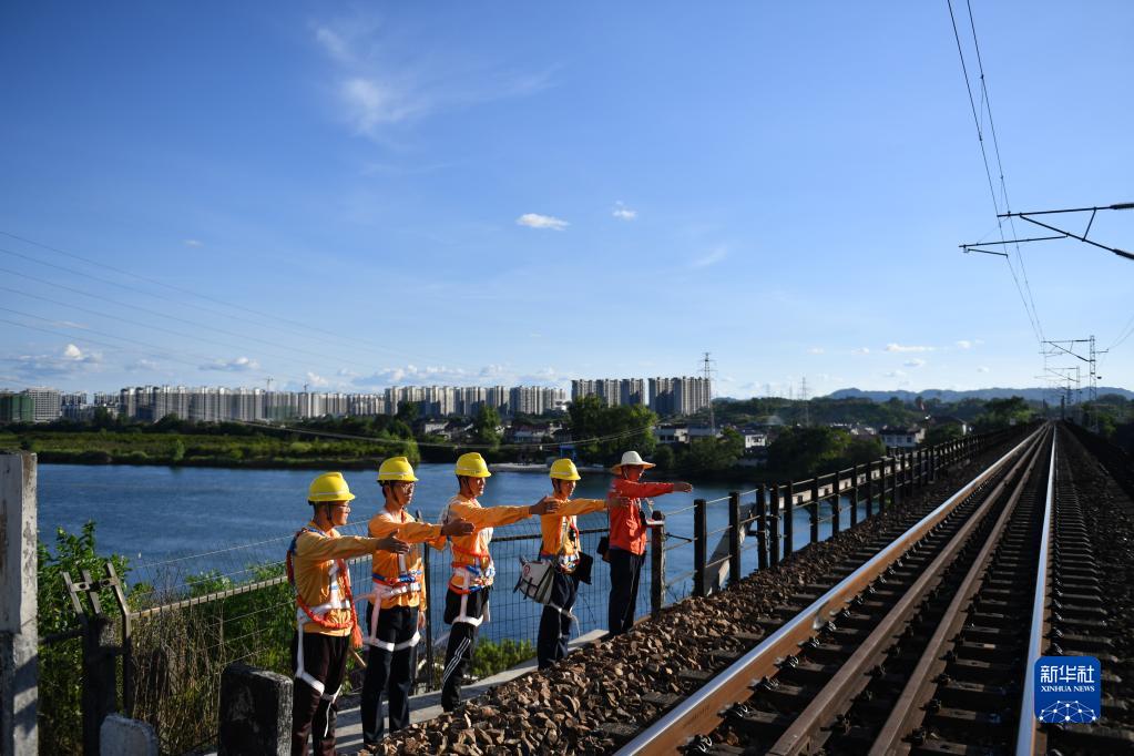 8月11日,在沪昆铁路新舞水钢梁桥,桥隧工在巡检作业前确认来车情况。