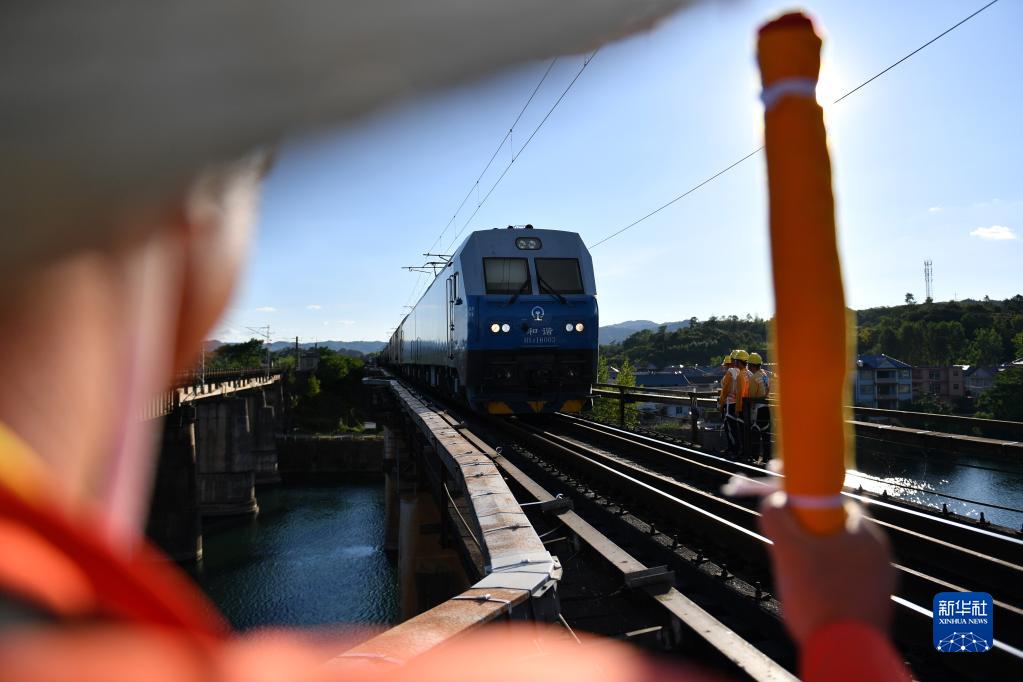 8月11日,在沪昆铁路新舞水钢梁桥,桥隧工等待列车通过后继续巡检作业。