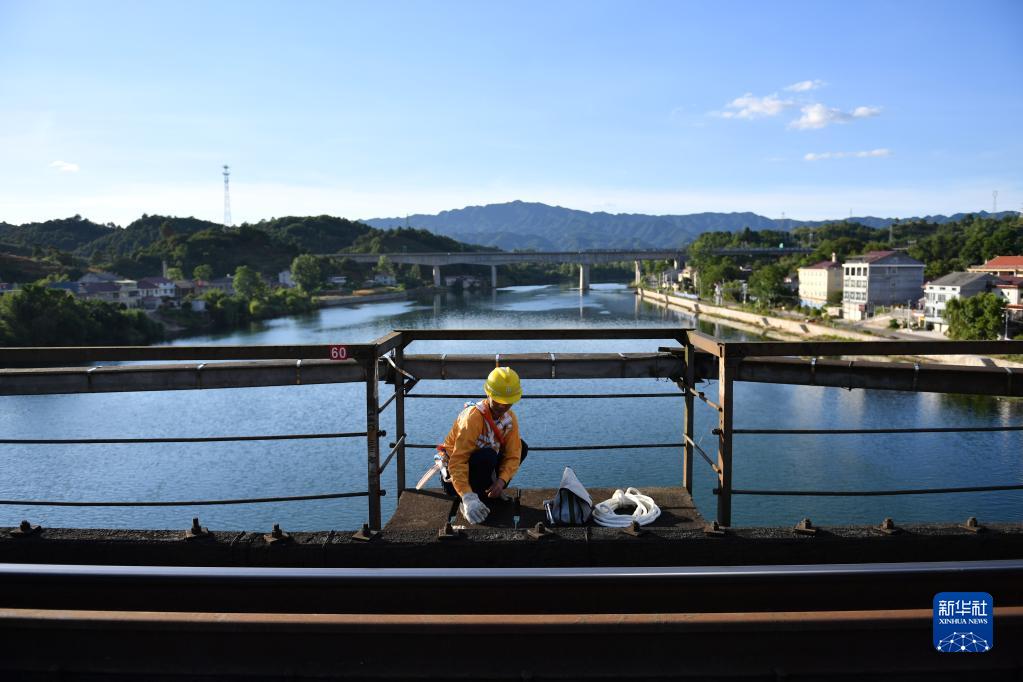 8月11日,桥隧工在沪昆铁路新舞水钢梁桥准备巡检作业。