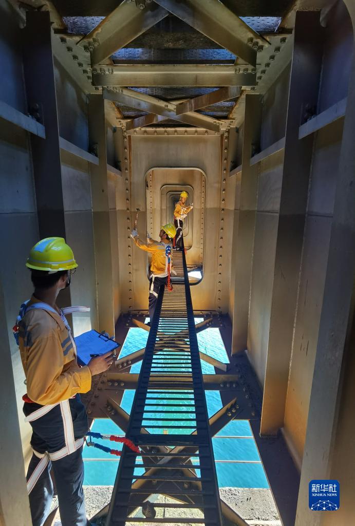 8月11日,桥隧工在沪昆铁路新舞水钢梁桥检查桥墩(手机照片)。