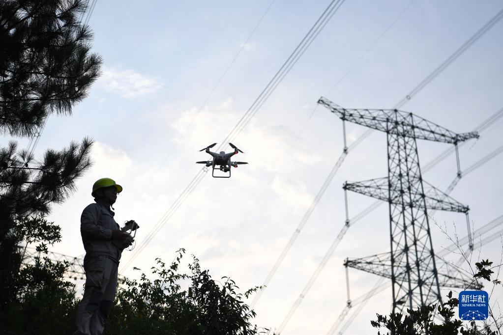 8月11日,安徽送变电工程有限公司广德运检站运维人员使用无人机开展线路巡检。