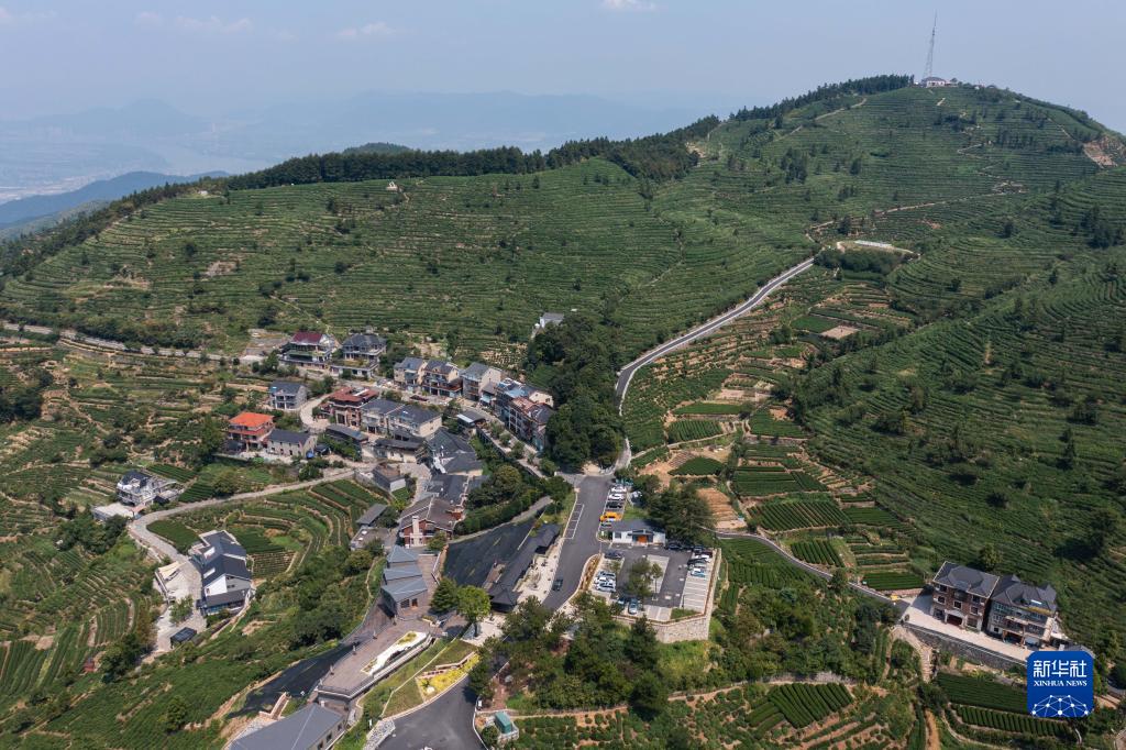 8月12日,空中俯瞰富阳区里山镇安顶村(无人机照片)。从2022年初开始,安顶村在完成安顶云雾茶核心区块116户350亩茶地流转,推进茶产业升级的同时,吸引新乡贤回归,利用自然风光、闲置房屋打造“星空露营”“云雾茶吧”“天空之镜”等景点,带动乡村百姓就业增收。