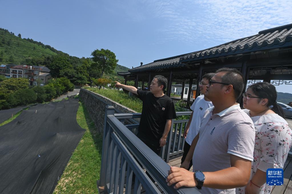 8月12日,回归新乡贤夏敏钢(左一)给来安顶村旅游的游客介绍乡村特色景点。