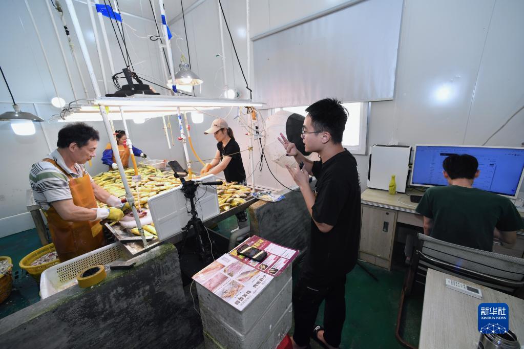 主播在福建省霞浦县“赶海父子”直播间内推介当地盛产的大黄鱼(8月10日摄)。
