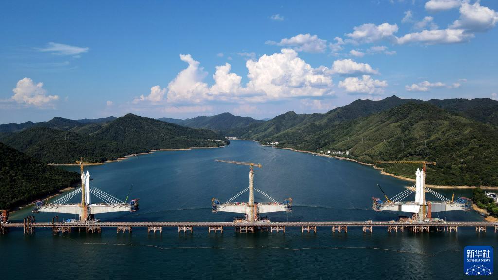 这是正在建设中的中国铁建大桥局池黄铁路太平湖特大桥(8月12日摄,无人机照片)。