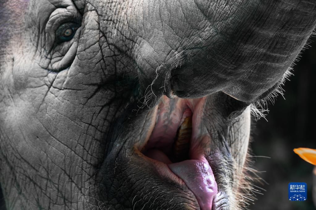 8月12日,广州长隆野生动物饲养员引导亚洲象张开嘴巴,以便检查它的臼齿健康状况。新华社记者 刘大伟 摄