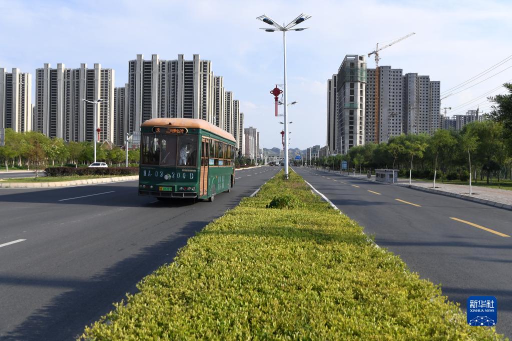 一辆新能源公交车行驶在兰州新区(8月9日摄)。