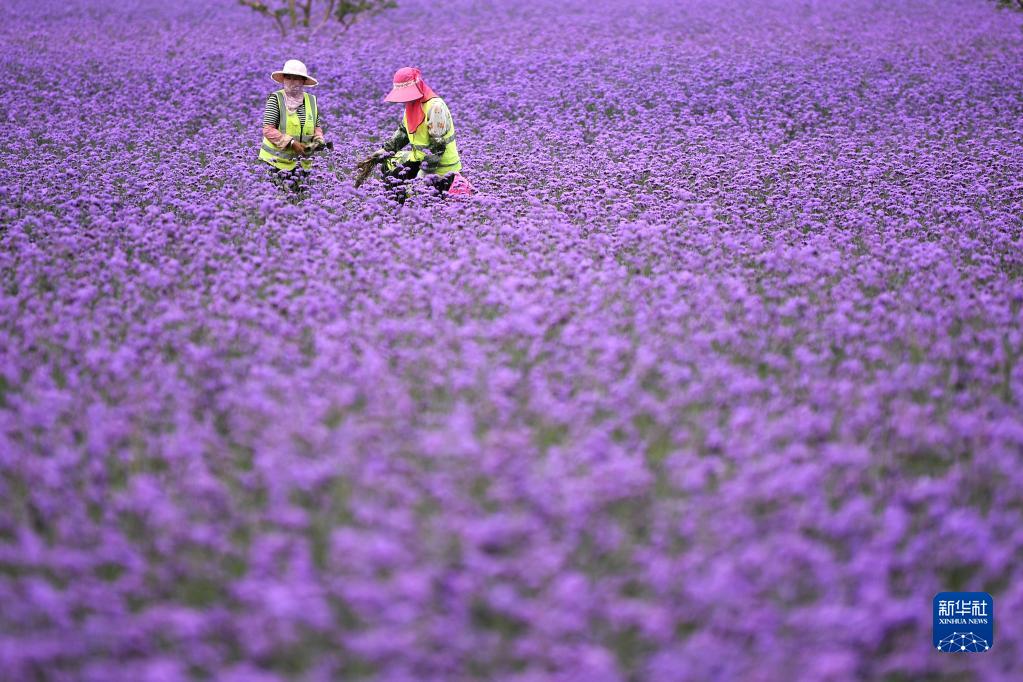 两名工人在兰州新区临港花海除草(8月10日摄)。