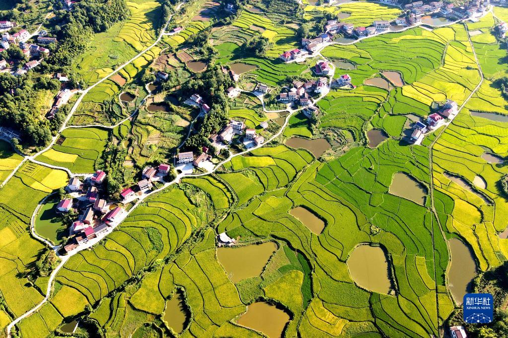 8月12日在湖南省双峰县井字镇拍摄的再生稻田(无人机照片)。