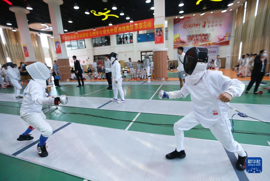 8月12日,击剑小选手在青岛通济实验学校体育馆进行角逐。