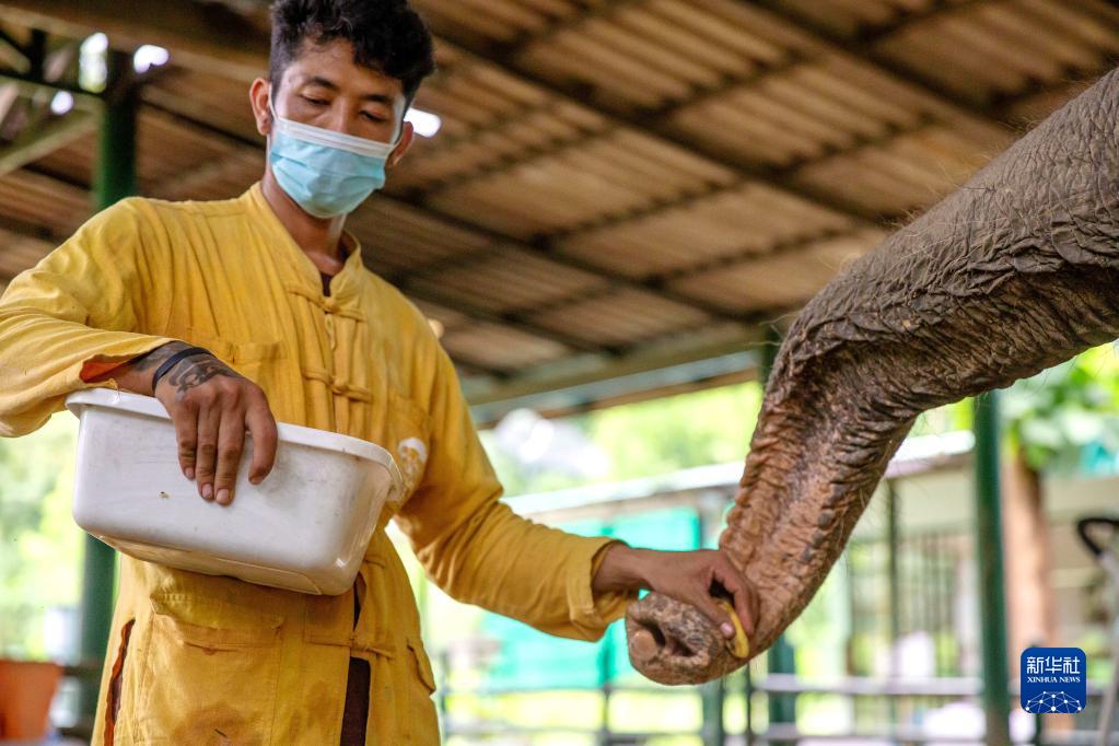 8月6日,在泰国南邦府“亚洲象之友”大象医院,工作人员给一头受伤的大象喂食。